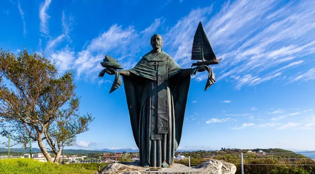Памятник выполнен по иконописному образу Святителя Николая Мысгорновского кисти путешественника Фёдора Конюхова. В правой руке у святителя мыс Горн, в левой – парусник.